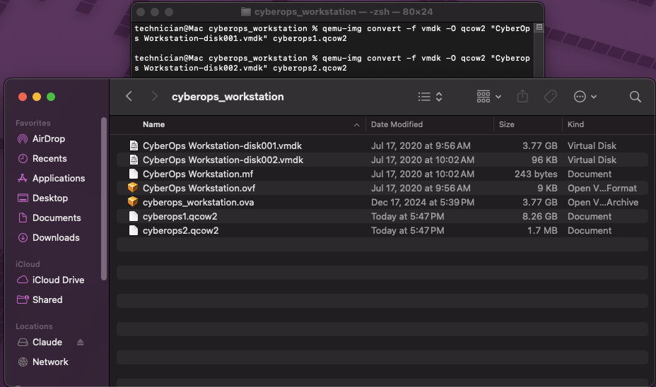 qemu-img convert -f vmdk -O qcow2 "CyberOps Workstation-disk001.vmdk" cyberops1.qcow2