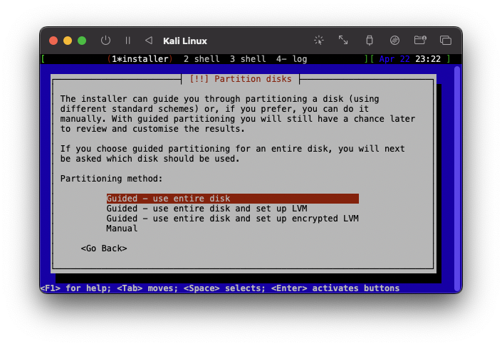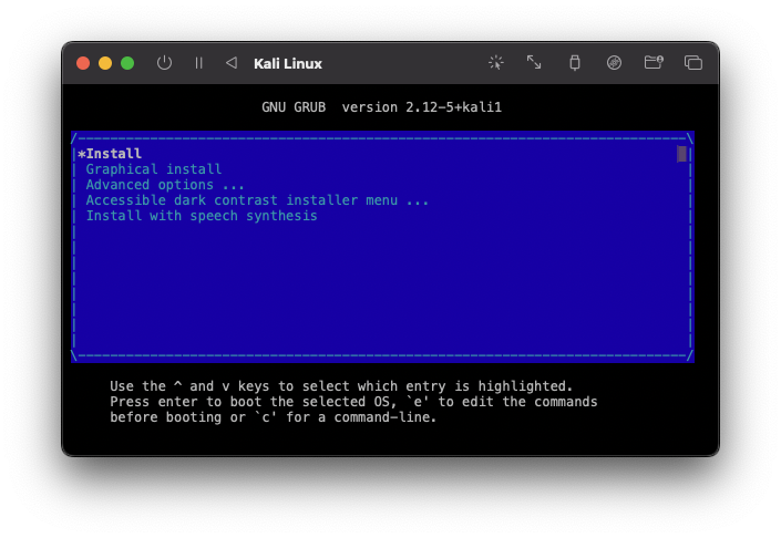 Due to a current bug in UTM, we need to install Kali Linux in console-only mode: