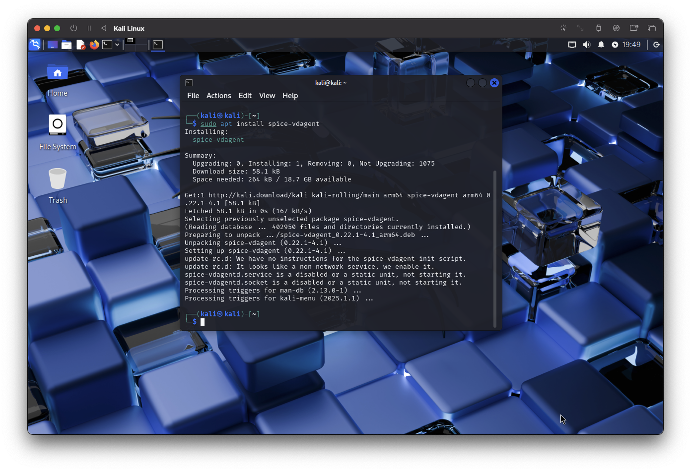 Your Kali Linux installation is now complete and optimized for Apple Silicon. You can proceed to install additional tools or configure the environment to your needs.